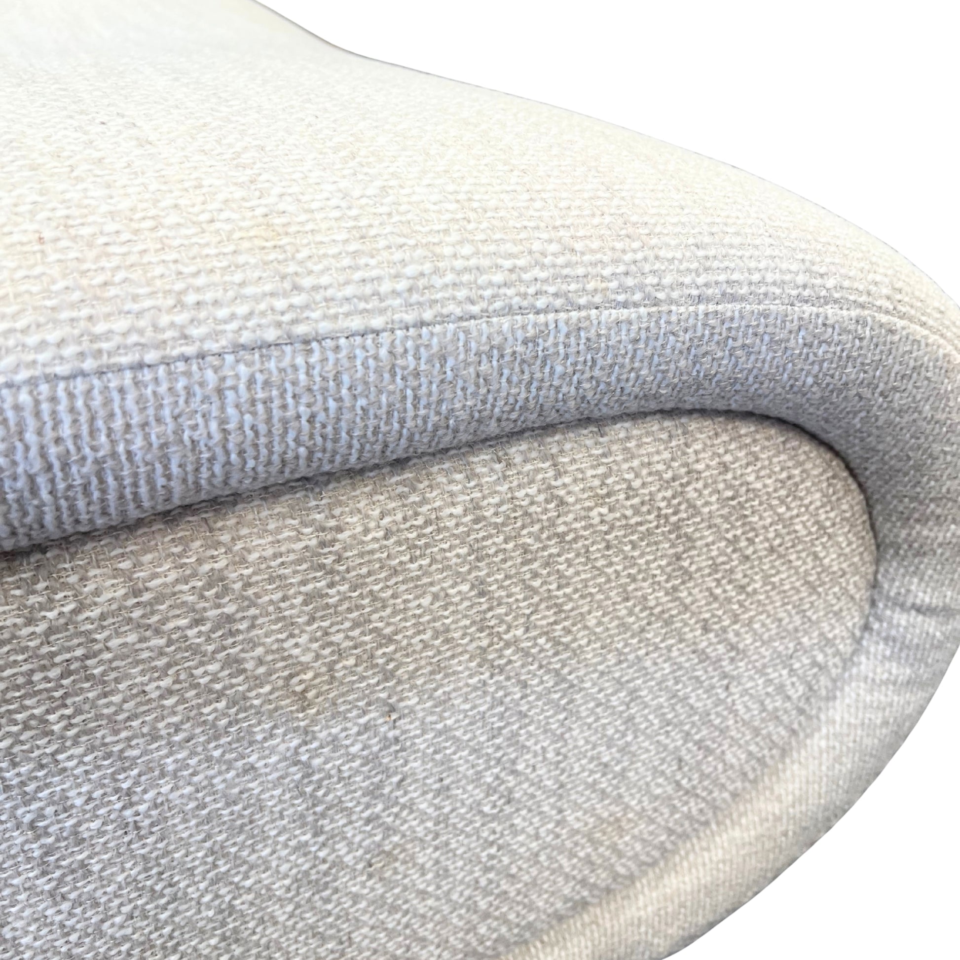 Boston Ottoman features a curved design in an oatmeal-toned fabric with refined piping detail. Its versatile style complements various interior decor settings.