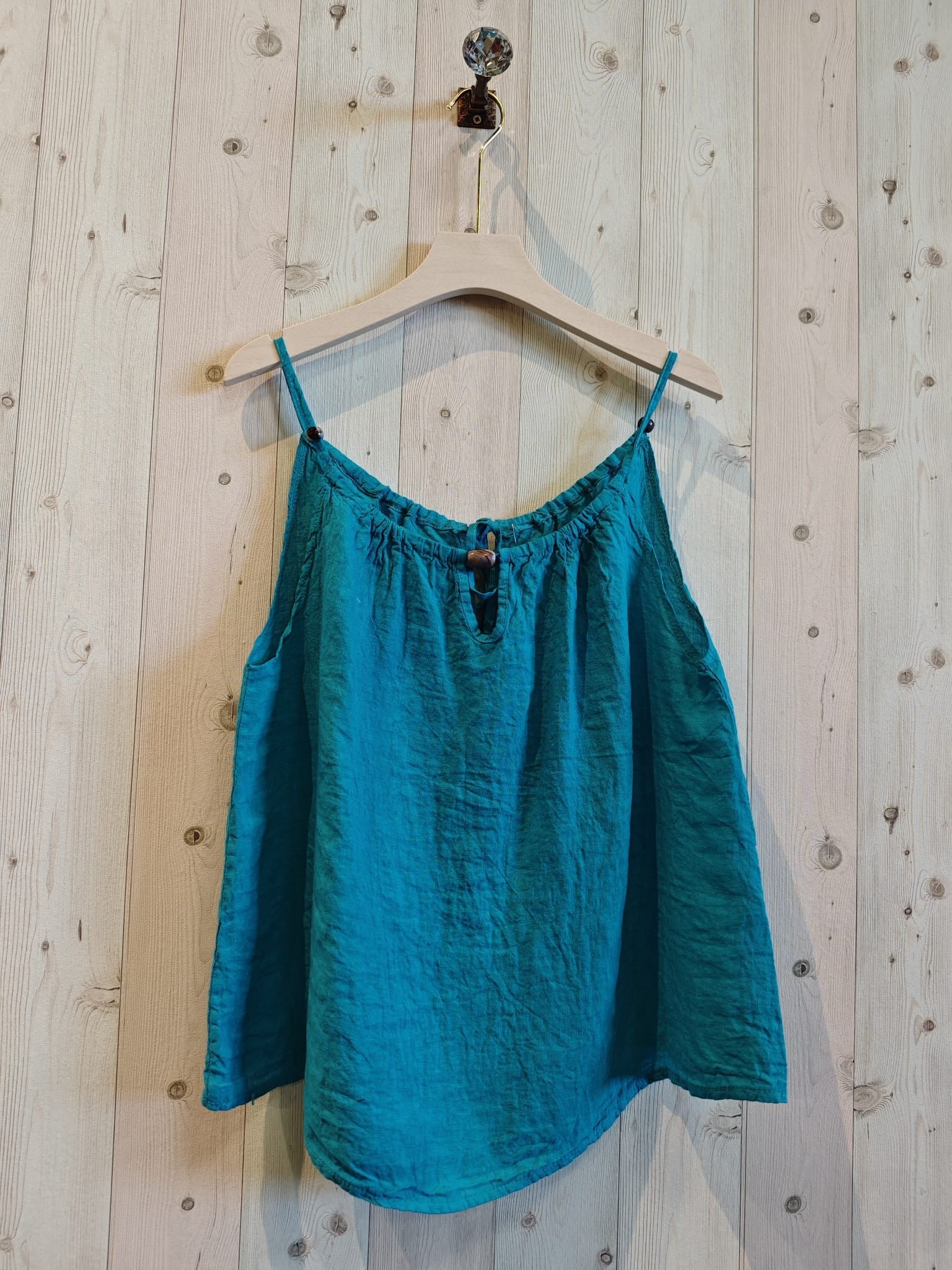 Hamlin is an Italian linen singlet with wood central tie detail