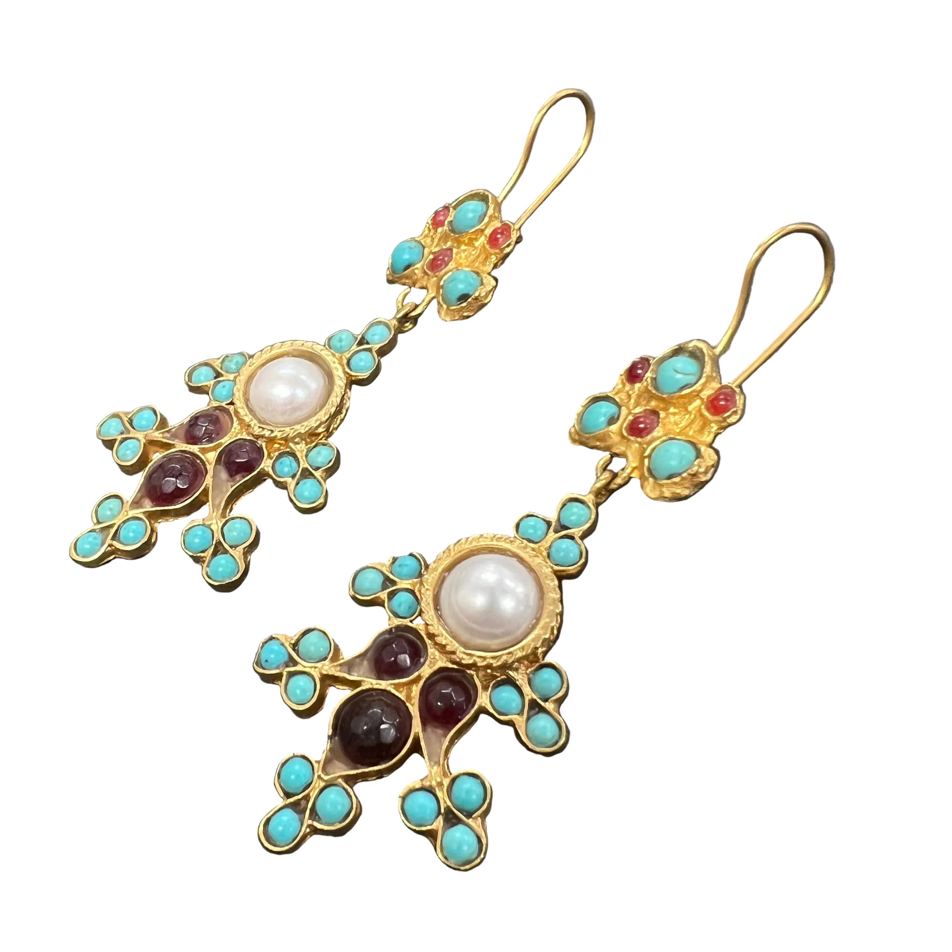 These handmade earrings are a striking fusion of old-world elegance and bohemian opulence, the Solara Pearl Drop Earrings feature a luminous freshwater pearl centre framed by intricate gold detailing. Accented with vibrant turquoise stones and deep garnet tones, these earrings are designed to catch the light and command attention. Lightweight yet statement-making, they bring warmth, colour, and artisanal character to both elevated everyday looks and special occasions.
